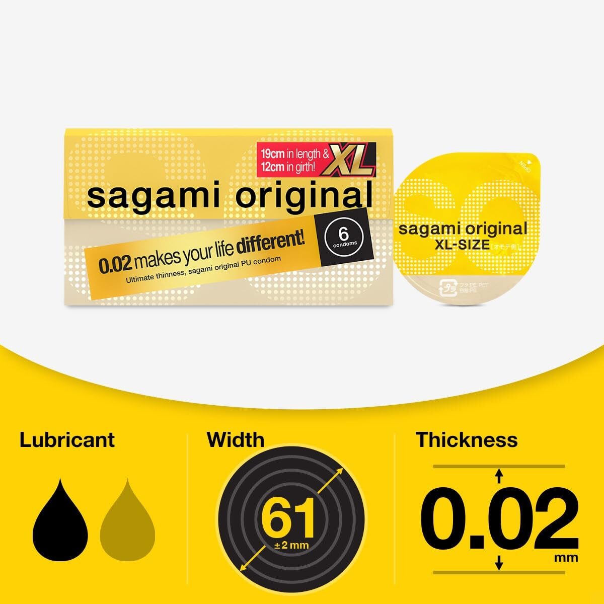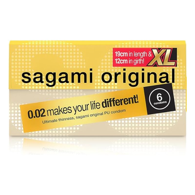 Sagami Original XL-size condom reaches 61±2mm and 190±10mm in width and length respectively, offering you a condom with XL space.